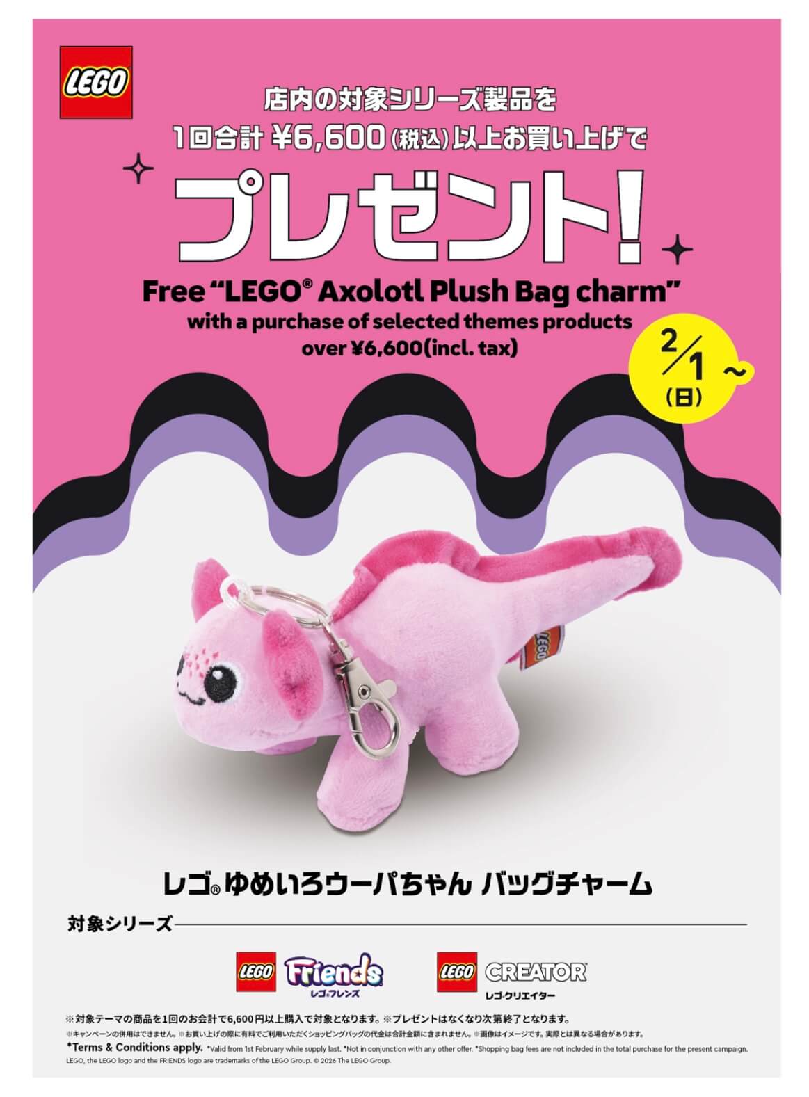 | 条件 | 店内の対象シリーズ製品を1回合計6,600円(税込)以上購入した人 対象シリーズ: レゴフレンズ レゴクリエイター ★キャンペーンの併用不可 |