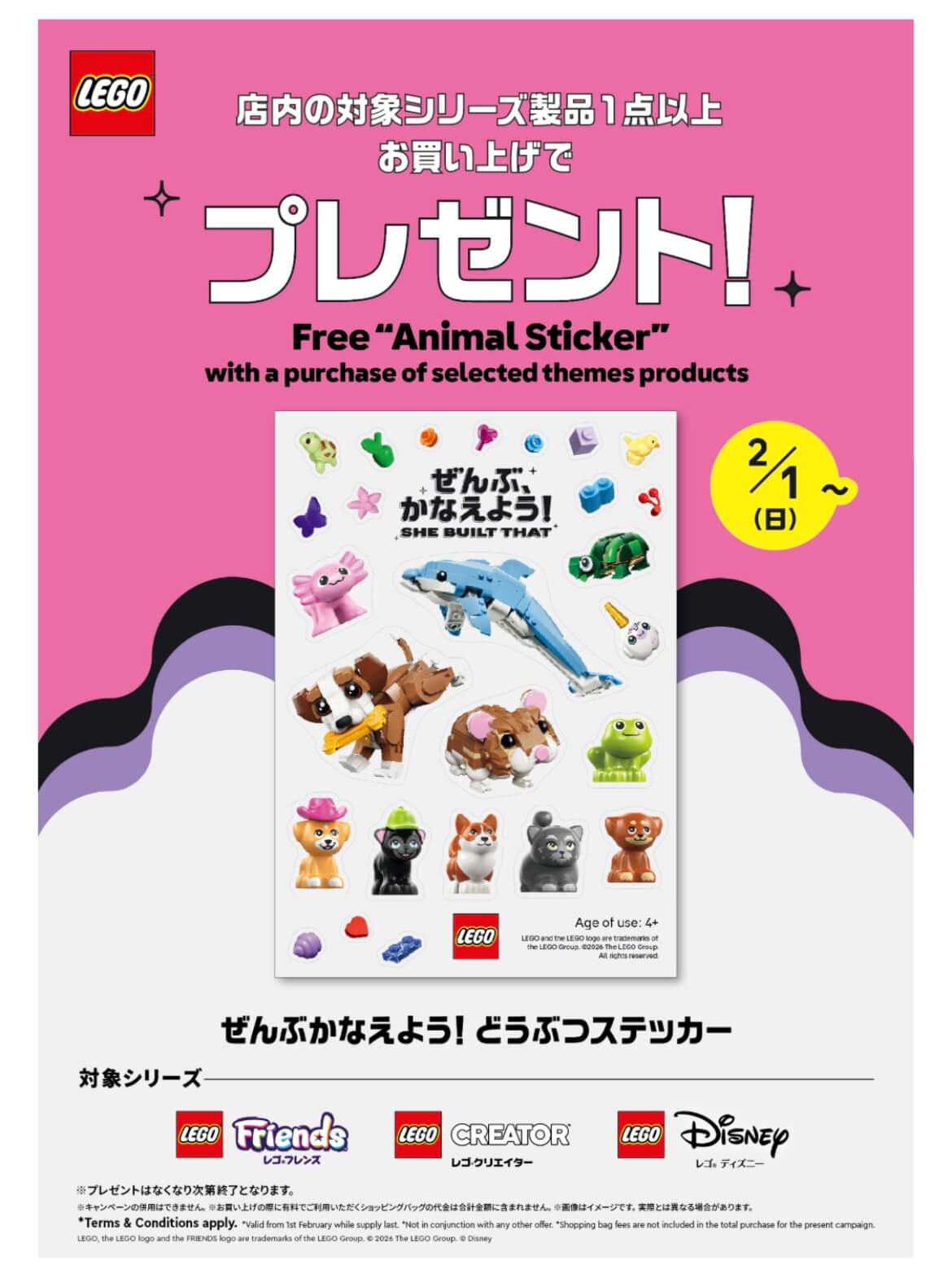 | 条件 | 店内の対象シリーズ製品を購入した人 対象シリーズ: レゴフレンズ レゴクリエイター レゴディズニー ★キャンペーンの併用不可 |